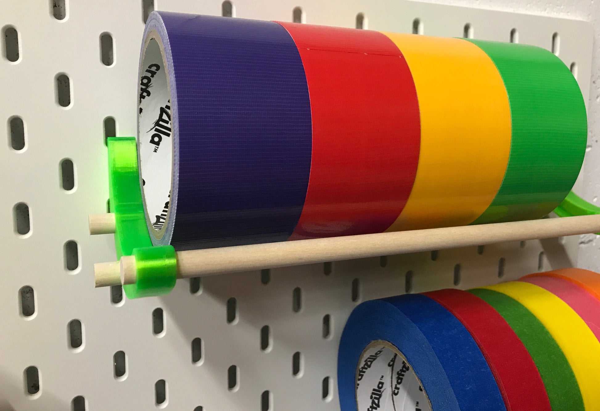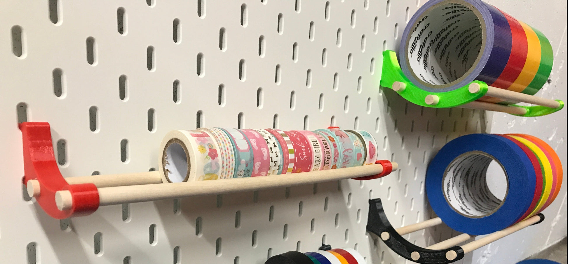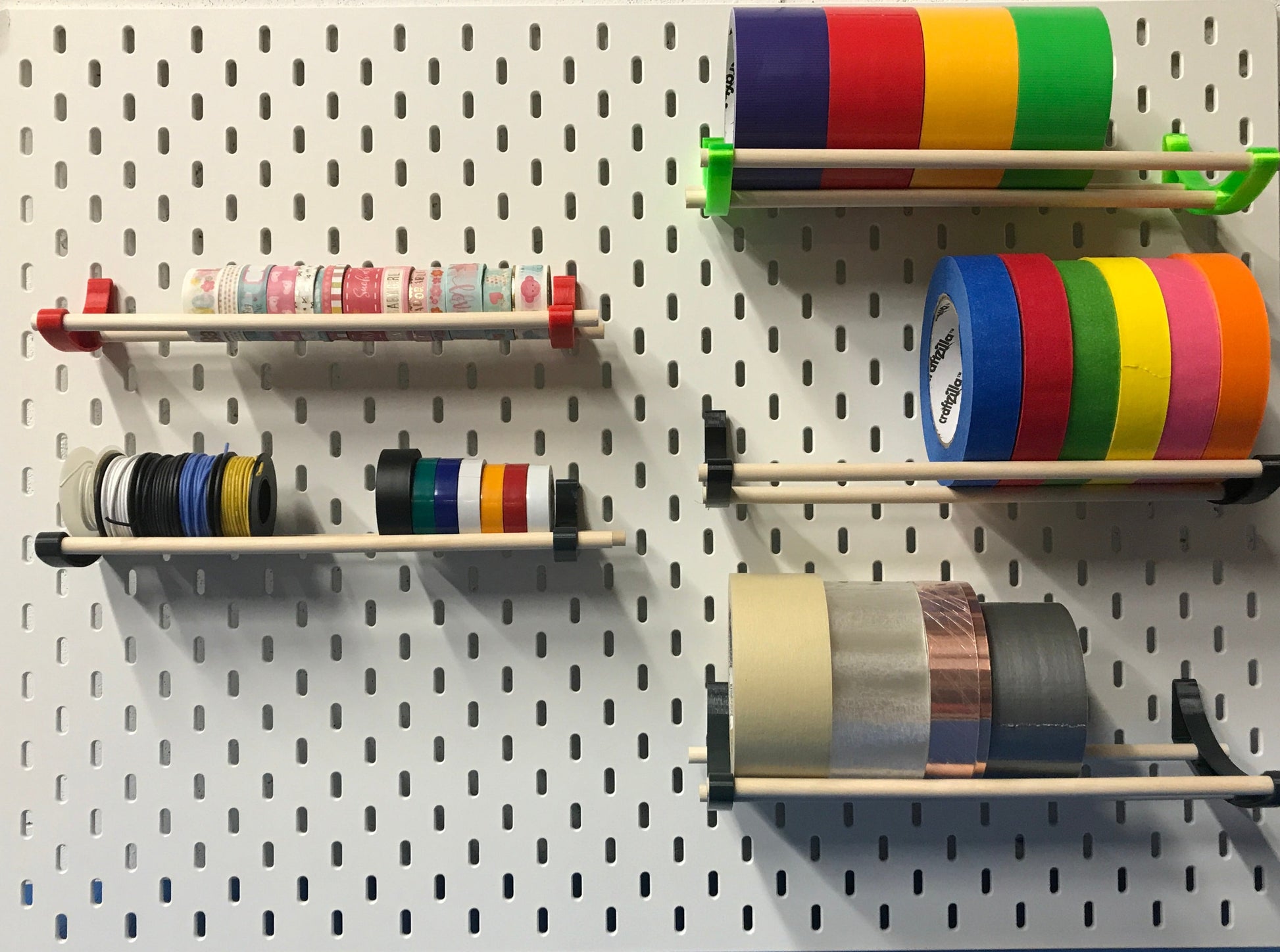 Easy to use organizer for rolls of tapes and ribbons. These hooks make it easy to organize your pegboard and created a nice racking system for all your tapes and rolls.